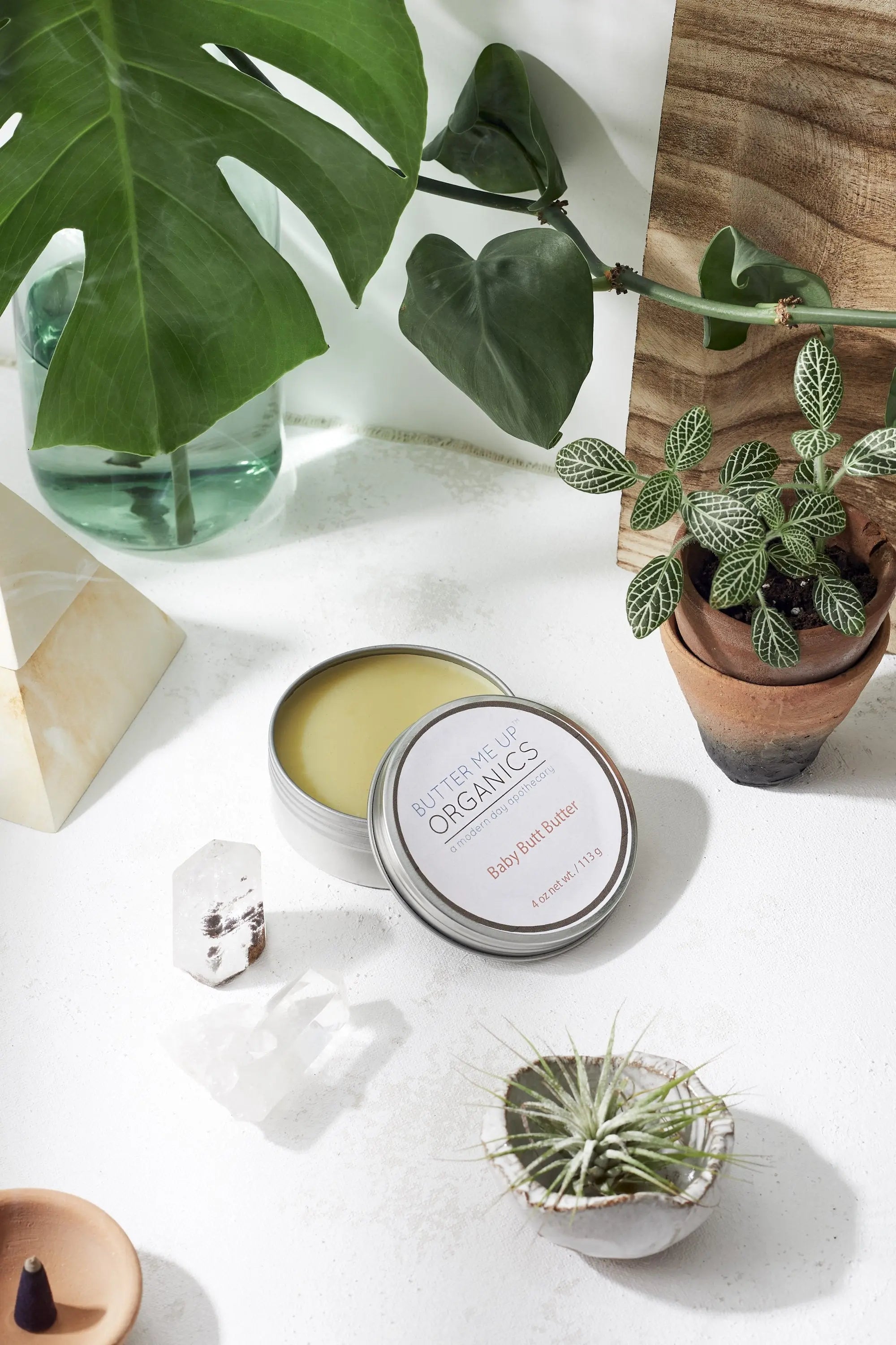 This all-natural butt butter is not only extremely soothing it's also very nutritive and healing for baby's sensitive skin. Great for diaper rash, cradle cap, and everyday use, the butt butter provides and a wonderful layer of moisture and protection for baby's delicate bottom. Works with cloth diapers and is the only product I'll use on my son. My son is five and my daughter is three and neither ever had any diaper rash at all.