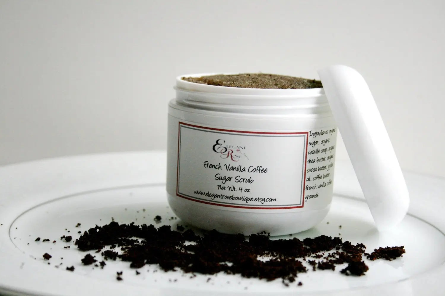 Ingredients: Organic sugar, organic castile liquid soap, organic shea butter, organic cocoa butter, organic jojoba oil, french vanilla coffee grounds, Tinosan SDC( a natural silver preservative).